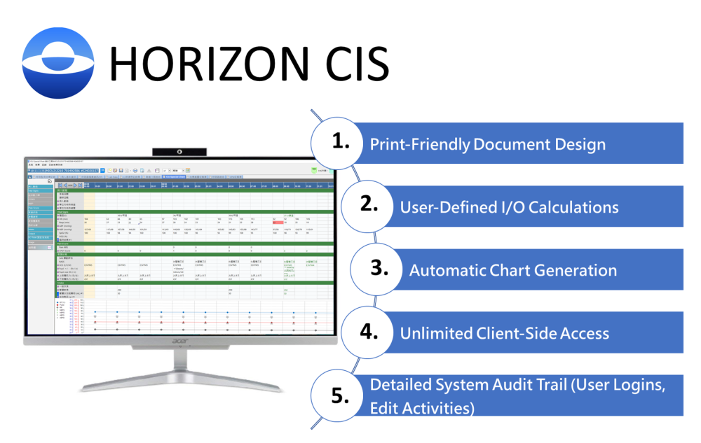 HORIZON CIS is a clinical information system designed for high-intensity environments such as operating rooms (OR), post anesthesia care units (PACS), intensive care units (ICU), respiratory care center (RCC), and hemodialysis centers. Built on a patient-centered foundation, it integrates automated device data, clinical decision support, and intelligent form management in one seamless platform. Fully compatible with HIS, LIS, etc., and other hospital systems, it enables real-time monitoring of patient status, vital signs, and treatment progress—creating a connected and intelligent clinical environment.